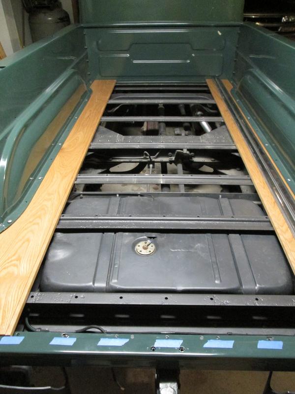 I temporarily assembled the bed walls so I could get an accurate measurement for the bed wood. Cut all the pieces today and didn't mess any of them up! Extended the cross member over the gas tank 2 inches to reach the outer bed bolts. Everything seems to be lining up well. Now to mark and drill the 8 bolts that fasten the floor to the frame. Wish me luck!