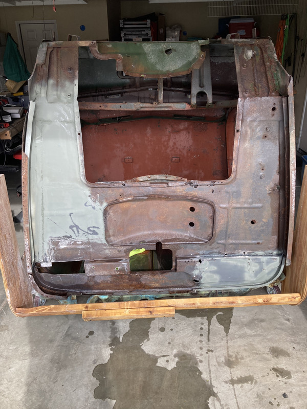 I just soda blasted the bottom side of the floorpan with a pressure washer, because the quotes to sand blast it were crazy. It worked very well at blasting away enough of the rust to find the holes, but I thought it was working poorly at getting rid of the rust. Until the floorpan started drying and then, it turns out, it also did an ok job of removing a lot of rust; not great, but ok. Like I will still have to wire brush. My impression with sand blasting is that it gets rid of all the rust, but I have never sandblasted nor have I had anything sandblasted. I soda blasted, with a water pressure washer, because this is California, and you never know who is gonna get bent out of shape with sand in the air. The baking soda either dissolves or runs down the driveway with no one coming out to inspect and hassling me about the small amount of soda that is not dissolving and eventually making its way to the storm drain. I can use blasting sand with the pressure washer with little resulting sand in the air, but it will be obvious to anybody walking by that there is sand going to the street and therefore to the storm drain. So, if I use blasting sand, I can do it when most folks have left for work, and probably get away with it without the EPA bringing a SWAT team to my address. Have you ever used both soda blasting and sand blasting? Is one more effective than the other? I think the soda costs more than the sand, and it takes a fairly long time to get down to bare metal. I would really like to hear from someone who has tried both.