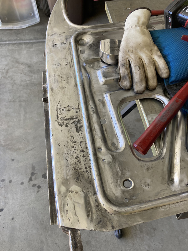 There are a bunch of drilled small holes in the inner door skin. I don't think they belong, (are original), on the door skin, because I have a new inner door skin for the other door and it has no such holes. If the holes do not belong there, I will weld them up. The following post to this is a second photo, because I can't figure out how to post more than one photo at a time.